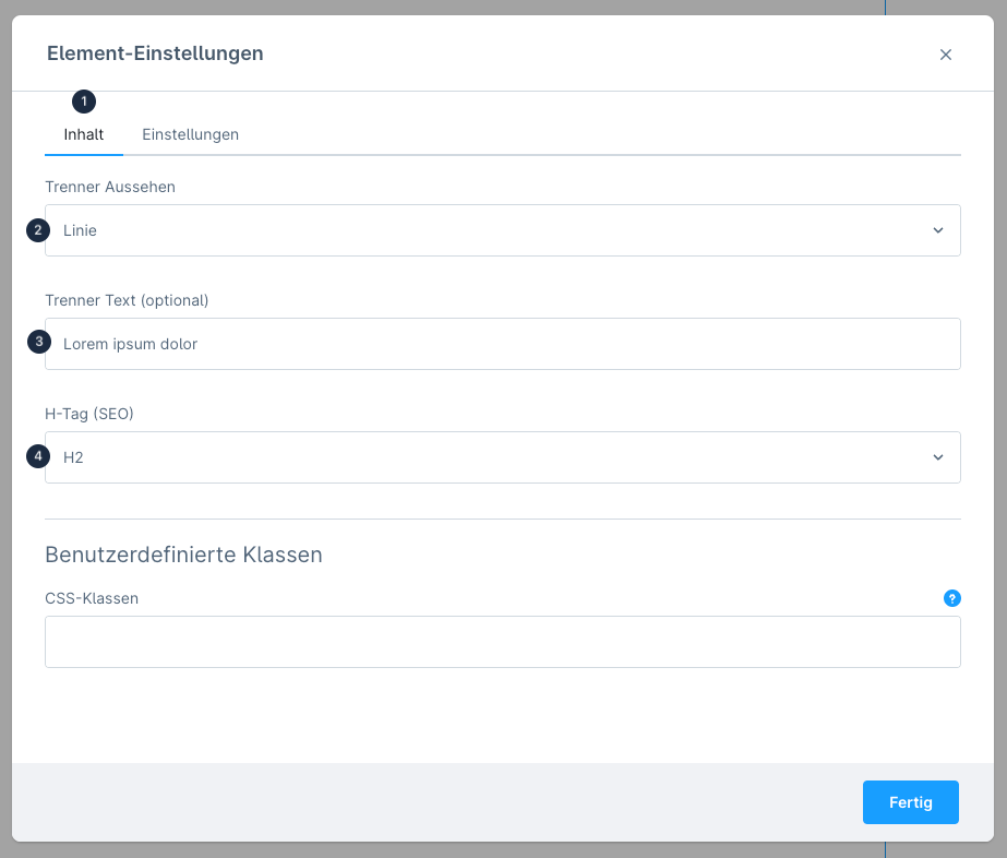 Im Tab **Inhalt (1)** kann das grundlegende **Trenner Aussehen (2)** definiert und ein optionaler **Trenner Text (3)** festgelegt werden. Über die Einstellung **H-Tag (SEO) (4)** lässt sich der Text auch optional als Überschrift auszeichnen, wodurch sich auch semantisch suchmaschinenoptimiert Zwischenüberschriften setzen lassen.&#x20;