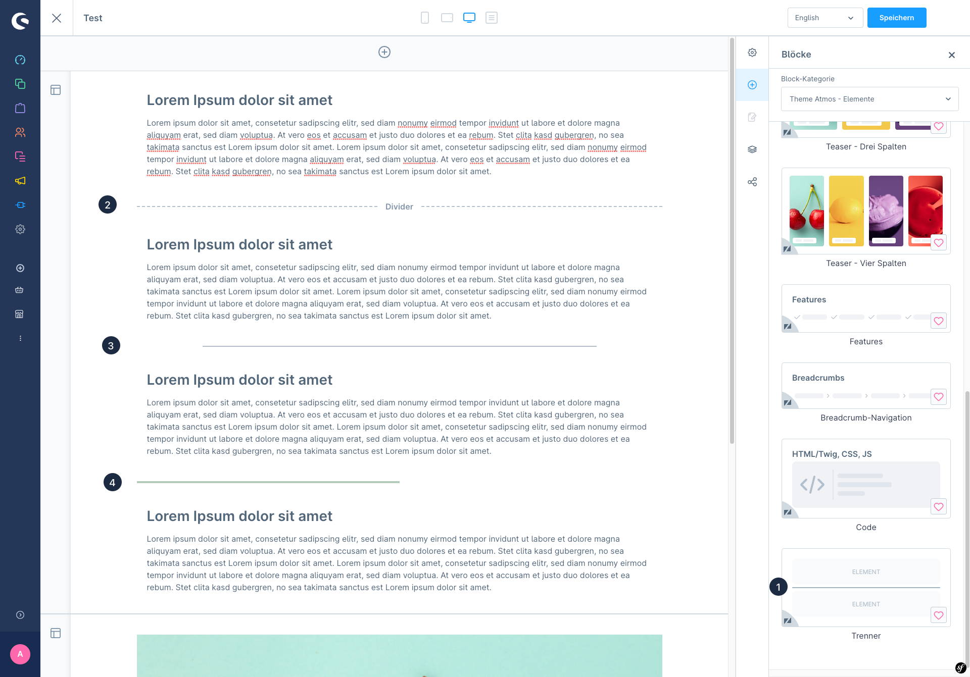Das **Divider-Element (1)** befindet sich in der Liste der auswählbaren Elemente des Themes. Mit diesem Element können verschiedene Elemente / Blöcke voneinander getrennt werden. Der Teiler kann in den Einstellungen verschiedene Stile haben.