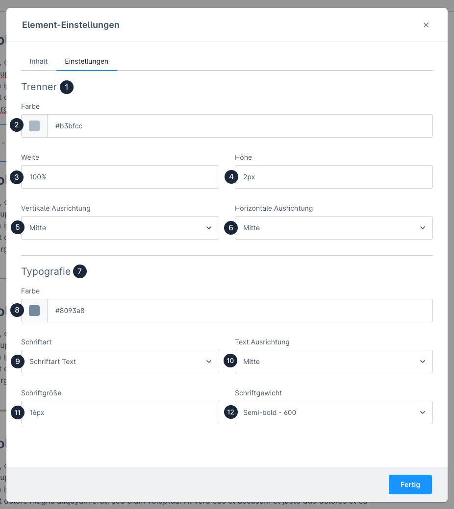 Diese Einstellungen sind sichtbar, wenn im Reiter **Inhalt** ein **Trenner Text (optional)** vorhanden ist. Hier können die **Farbe (8)** und die globale **Schriftart (9)** definiert werden. Die **Text Ausrichtung (10)** definiert, an welcher Position der Text auf dem Trenner angezeigt wird. Du kannst den Text links von der Trennlinie, zwischen den Trennlinien oder rechts von der Trennlinie platzieren. Lege  die **Schriftgröße (11)** und die **Schriftstärke (12)** des Trenner Textes fest.