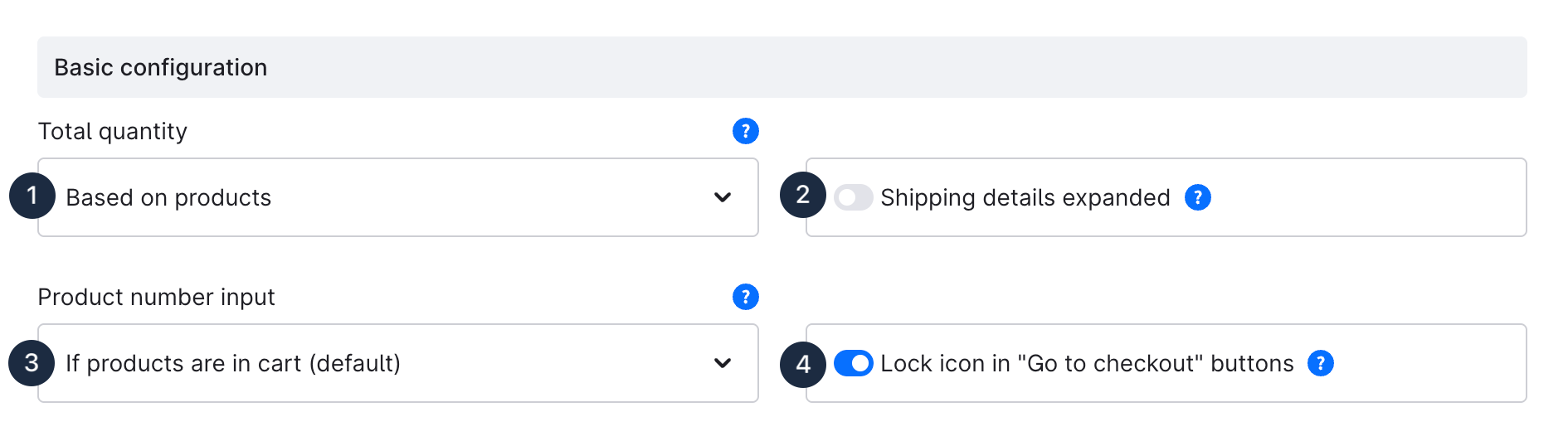 With the option **Product number input (3)** you control the function in the Offcanvas shopping cart. Here you can choose between the three modes: `Show never`, `Show always` and `If products are in cart`.\