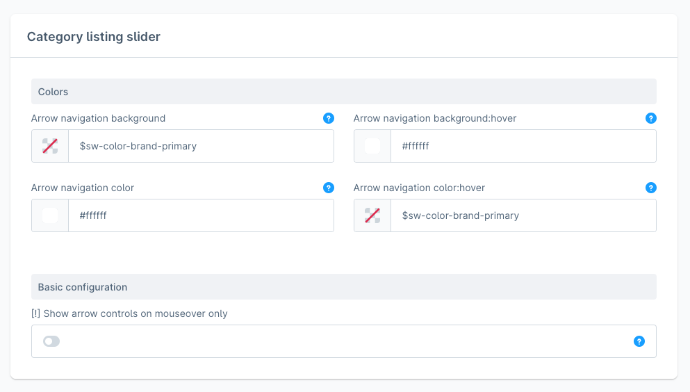 In addition to the general settings for the foreground and background color of the slider navigation arrows, the option **Show arrow controls on mouseover only** can also be activated here, similar to the other sliders.