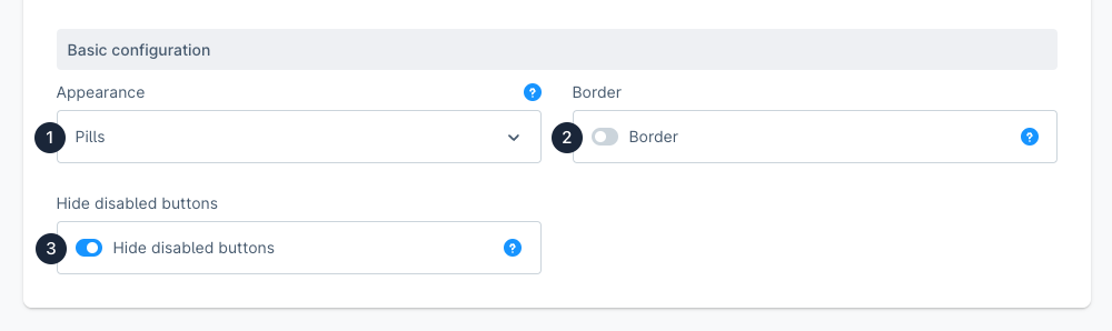 The **Appearance (1)** of pagination can be represented as `pills` and `standard`. Elements defined as `pills` have a distance to each other.