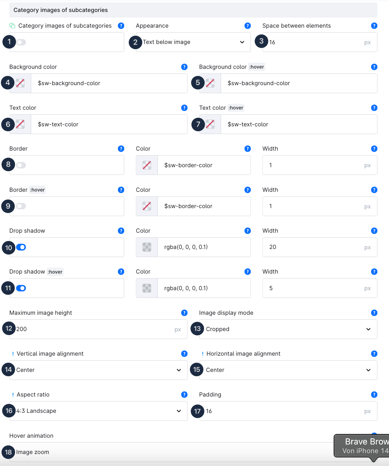 Additionally, you can configure a **Border (8 and 9)** and a **Drop shadow (10 and 11)**.