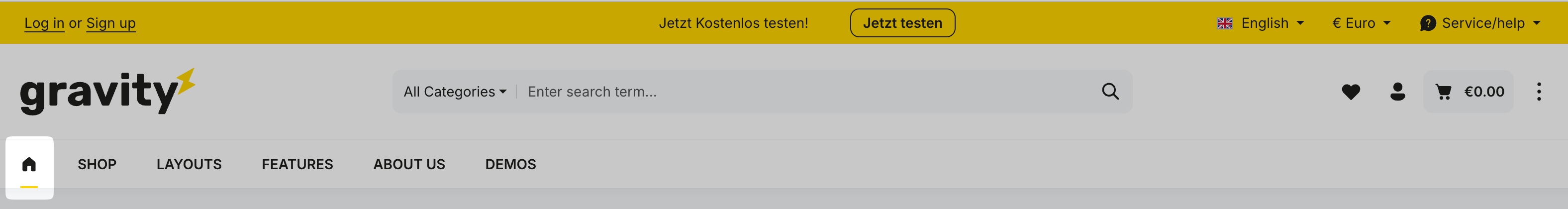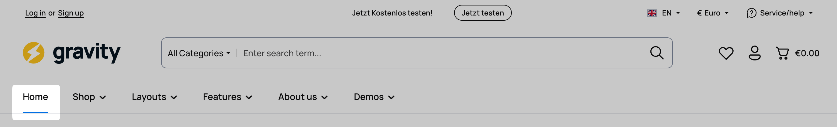 <figure><img src="https://2915610672-files.gitbook.io/~/files/v0/b/gitbook-x-prod.appspot.com/o/spaces%2F4i6VN0FeNAgRFLwVM2Cr%2Fuploads%2FkIepVM9UMbKNajWLHeAP%2Fdocs-config-theme-header-main-navigation-general-home-active-storefront-example.png?alt=media&#x26;token=10191ee0-7221-4606-b0e0-b58c2a3b8257" alt=""><figcaption><p>Home-Link active status</p></figcaption></figure>