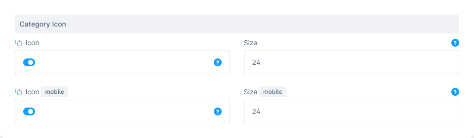 You can use the checkbox **Icon (1)** to activate the display of icons in the main navigation and set the **Size (2)** of the icons for the respective menu. In the mobile view, the main menu is shown as a mobile off-canvas menu. Here, too, you can use the checkbox **Icon mobile (2)** to determine whether category icons should be displayed in this menu. In the field **Size (4)** you enter the size of the image in pixels.