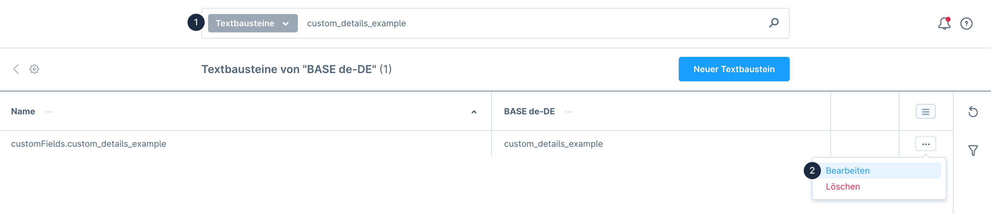 Wie in der blauen Infomeldung aus Schritt 1 bereits angemerkt, steht Dir nach den Anlage des Zusatzfeldes ein Textbaustein zur Verfügung, welcher in der Storefront als Label ausgegeben werden kann. Über *Einstellungen > Shop > Textbausteine > \[Textbaustein-Set wählen]* kannst Du nach dem technischen Namen Deines Zusatzfeldes **suchen (1)**. Klicke im Kontextmenü auf **Bearbeiten (2)** und hinterlege die Bezeichnung in allen verfügbaren Sprachen.