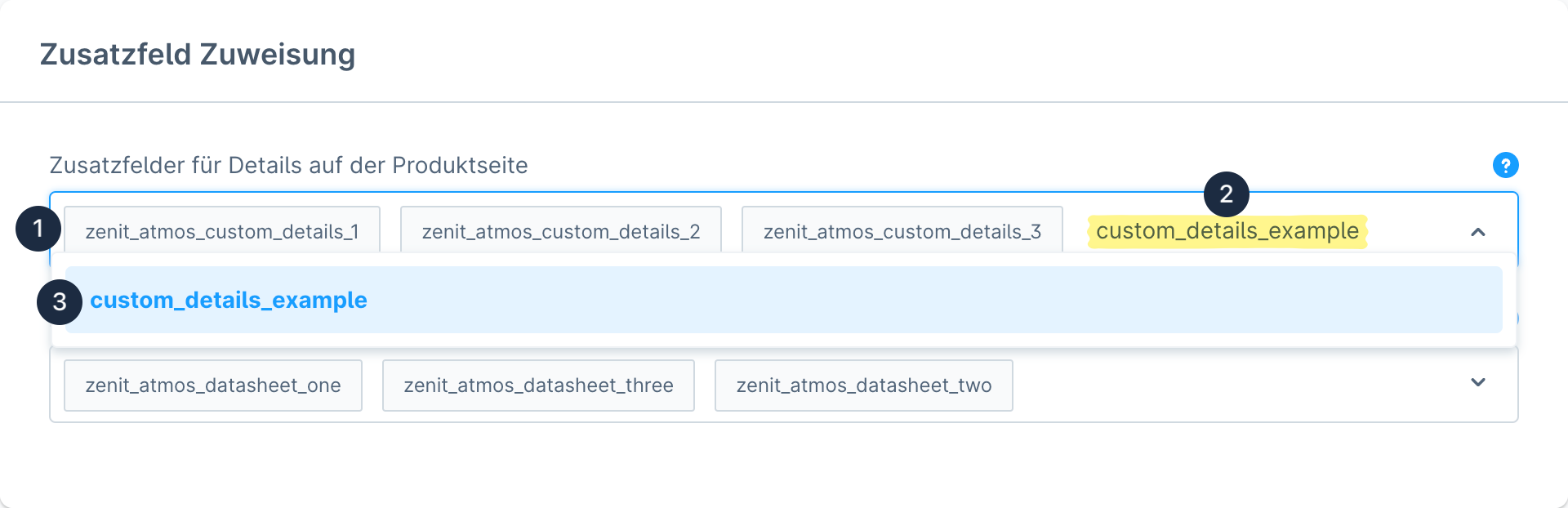 Über *Erweiterungen > Meine Erweiterungen > Tab: Themes > \[Theme auswählen] > Konfigurieren* gelangst Du in die Einstellungen des Themes. In der Auswahl **Zusatzfelder für Details auf der Produktseite (1)** kannst Du nun das neu angelegte Zusatzfeld suchen (2) und auswählen (3).