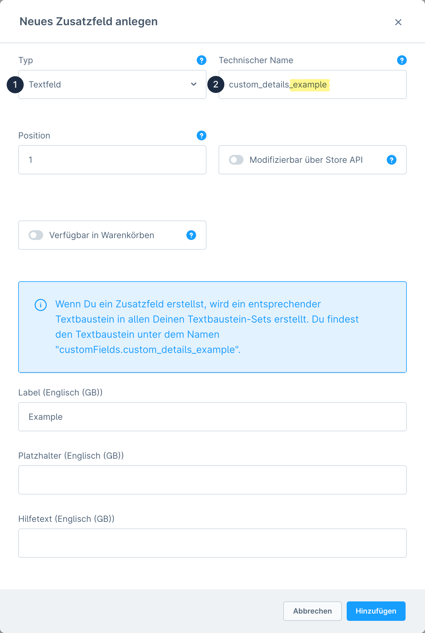<figure><img src="https://2797716245-files.gitbook.io/~/files/v0/b/gitbook-x-prod.appspot.com/o/spaces%2FglpRTGDOwN11YxqfJhAM%2Fuploads%2FE4qm67RFRUvBsulxsJRm%2Fdocs-de-settings-snippets-custom-field-textfield.png?alt=media&#x26;token=abc156b5-7b81-49b3-ae47-a3b1c01e56f9" alt=""><figcaption></figcaption></figure>